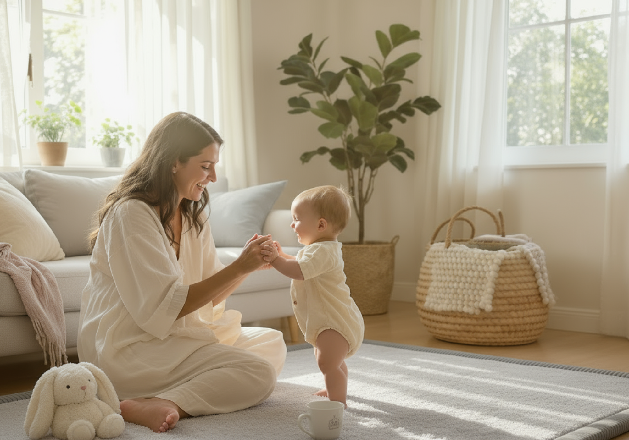 Ein weicher und dicker Teppiche bspw. schafft eine sichere Zonen für erste gemeinsame Gehversuche oder das gemeinsame bequeme Spielen am Boden.