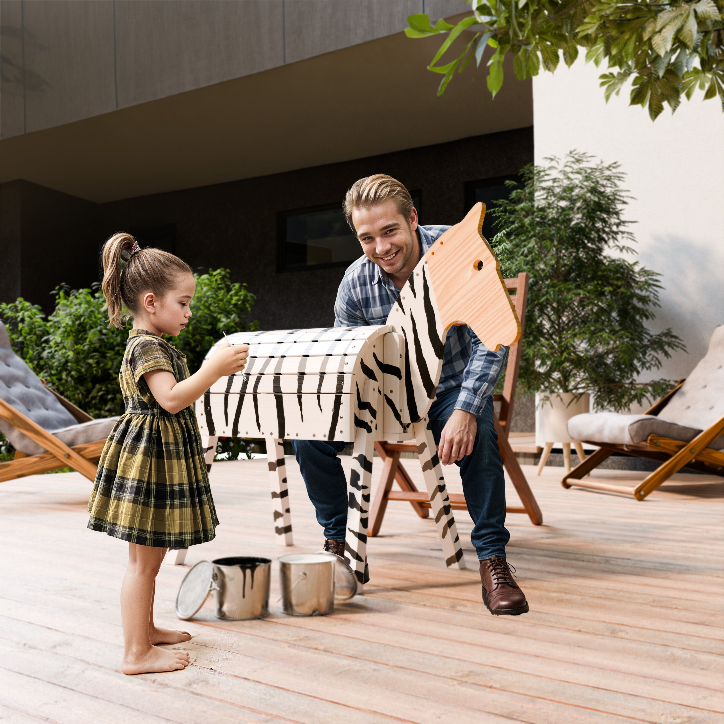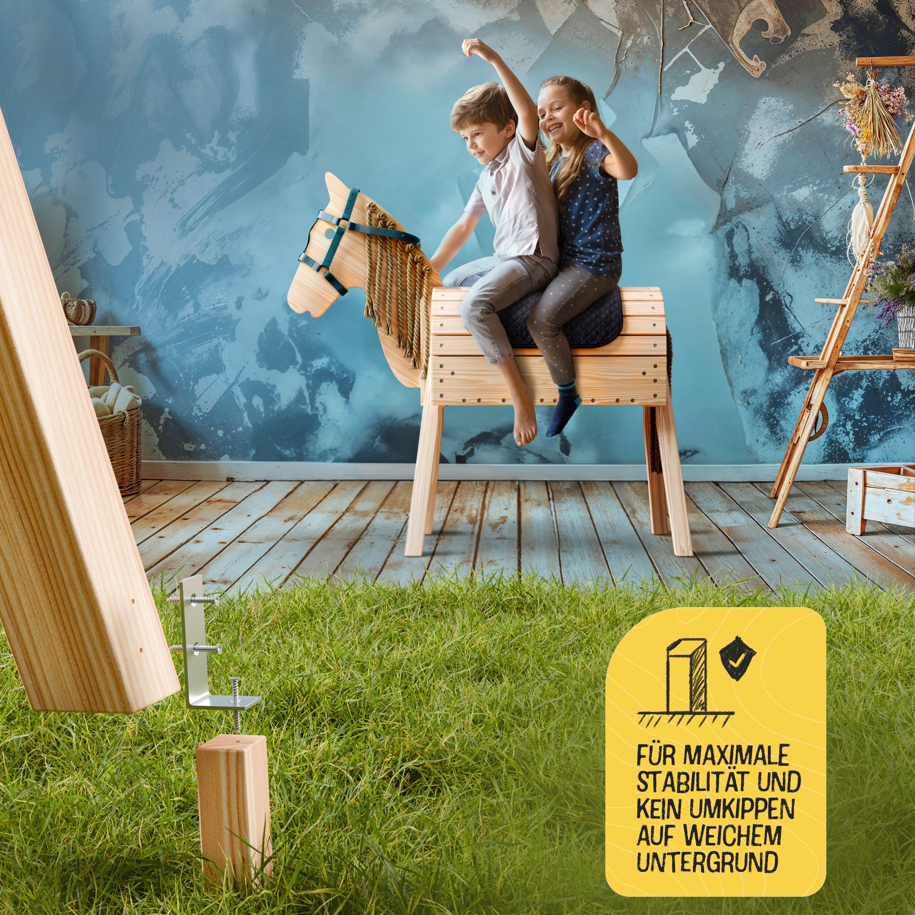 Ob im Wohnzimmer oder im Garten – dein Holzpferd steht fest, wo immer du spielen möchtest.