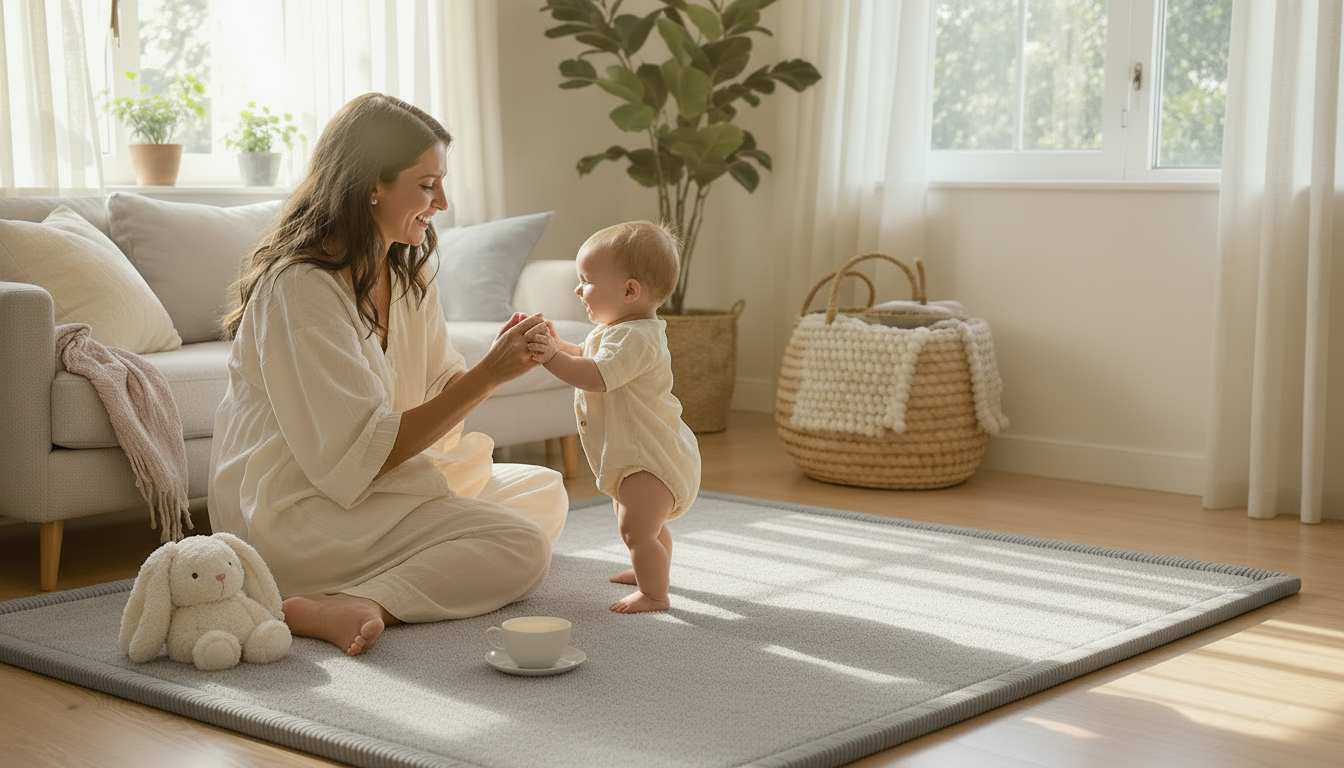 Auf mir wird gekuschelt, gespielt und deine ersten Schritte gemacht. Ich passe auf dich auf, wenn du fällst – weich, abwaschbar und rutschfest.