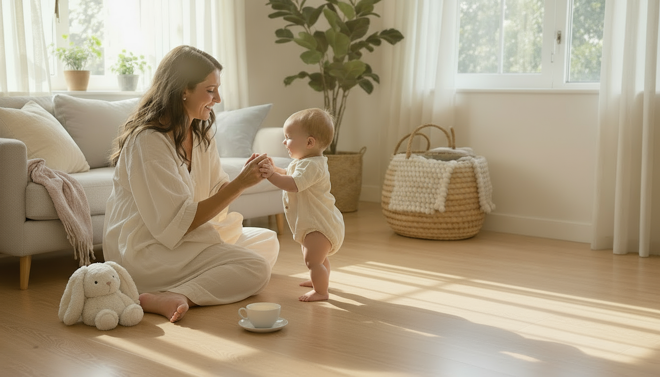 Danach lag sie mitten im Geschenkpapier, und dann stand sie auf einmal auf – wackelig, mutig, lachend. Der Teppich hat sie sanft aufgefangen, jedes Mal, wenn sie fiel.