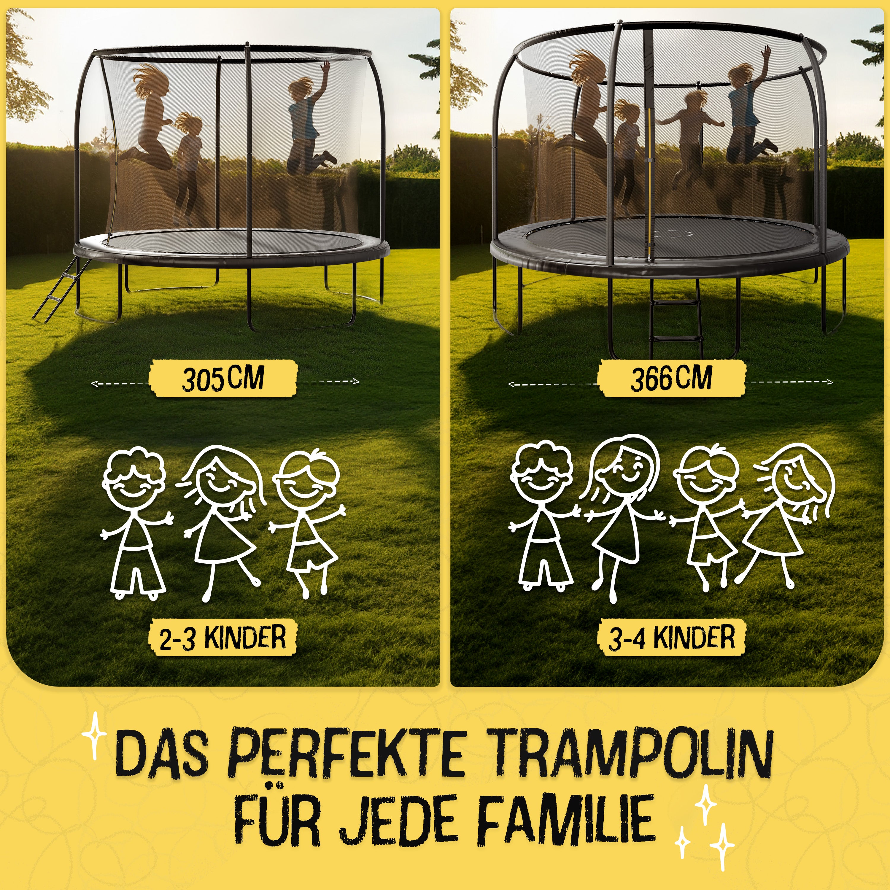 🟡 305 cm – ideal für 2–3 Kinder. Perfekt, wenn auch die Nachbarskinder ihr eigenes Trampolin haben. (Maximal: 100kg)