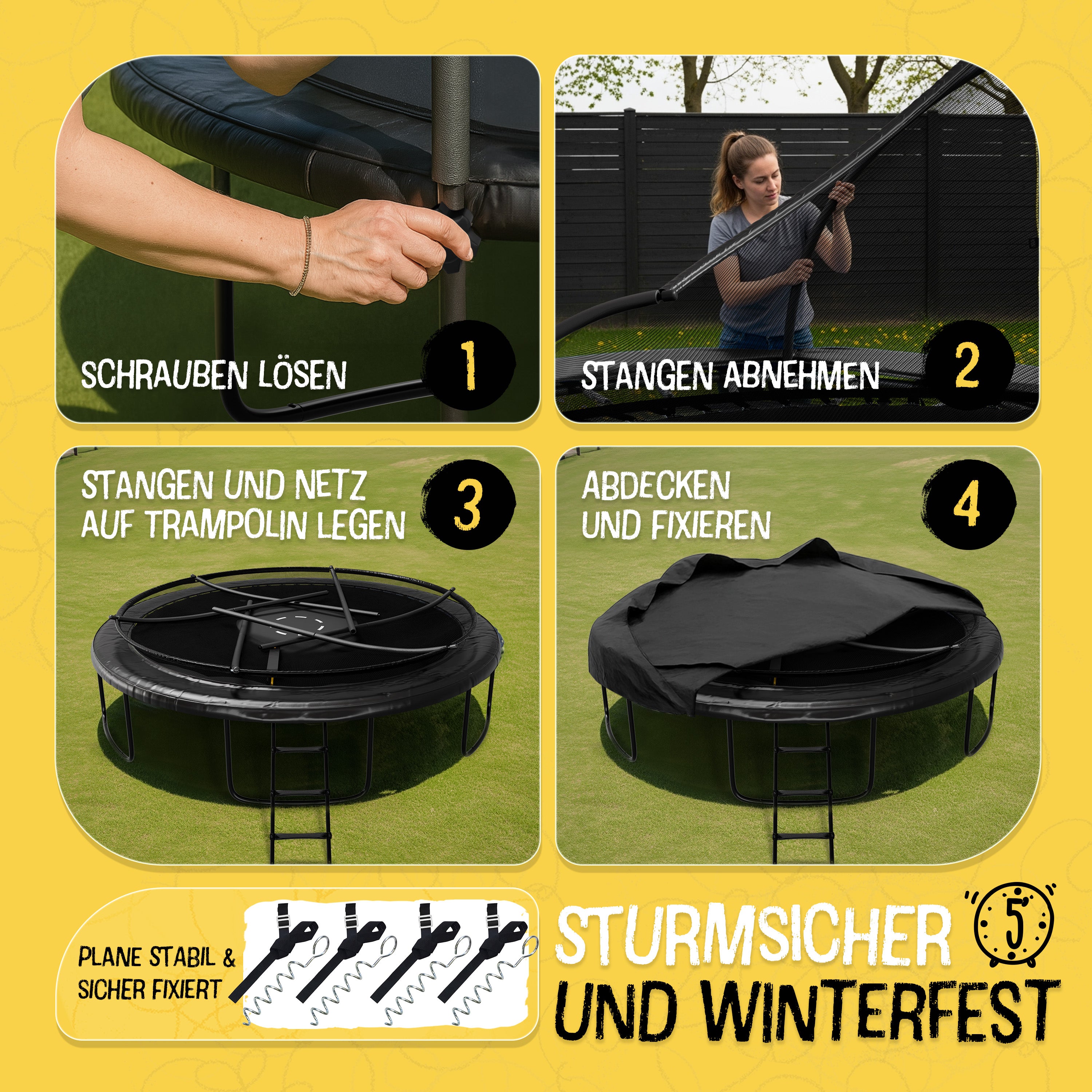 So bleibt euer Trampolin sicher vor Sturm, Schnee und UV-Strahlung und ist im Frühling sofort wieder einsatzbereit.