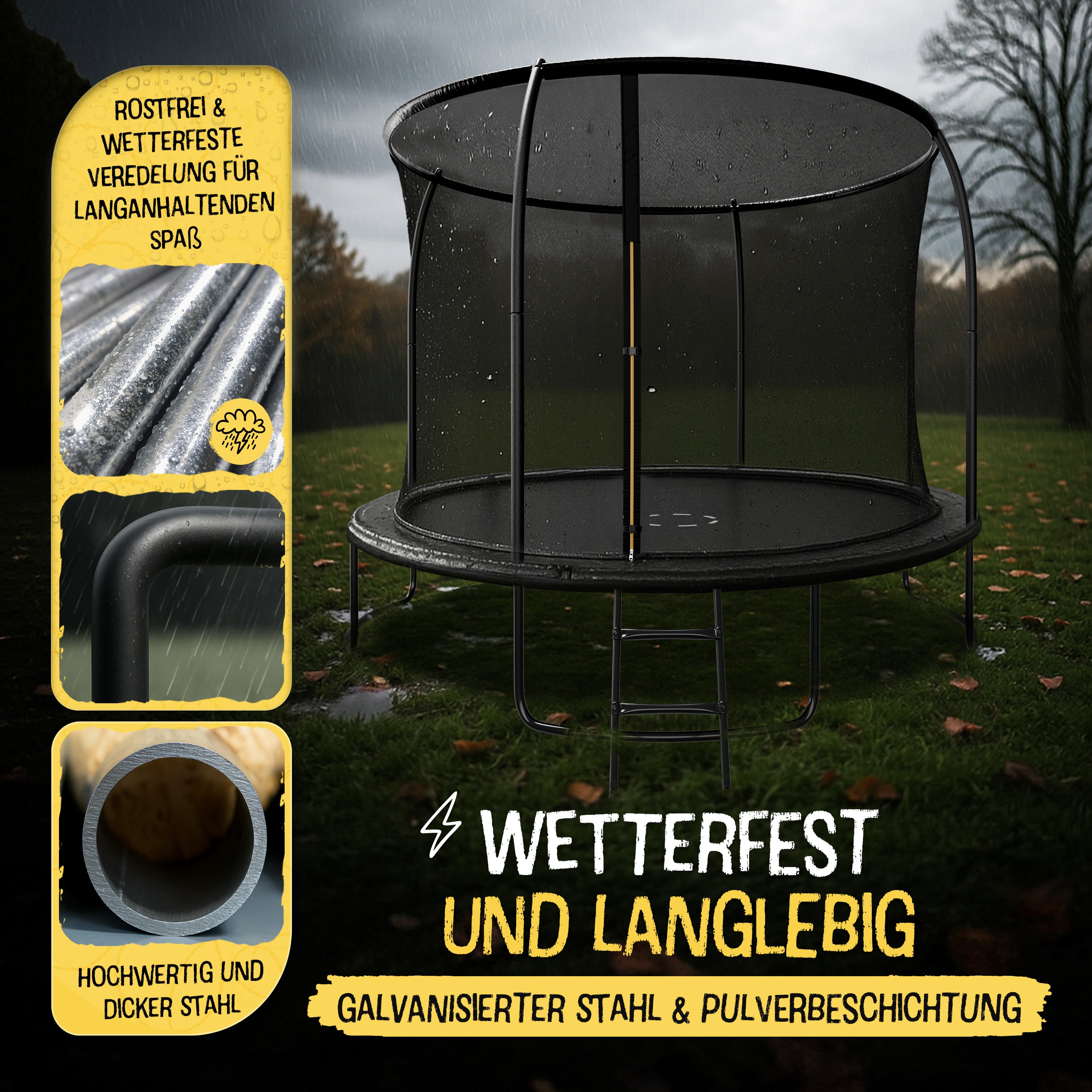 STARK GEPOLSTERT & GESCHÜTZT – Das innenliegende Netz schützt besonders gut. Sitzt vor den Feder, also kann kein Fuß durchrutschen. Belastbar bis 100 mit 305 cm ø / 150 kg mit 366 cm ø.