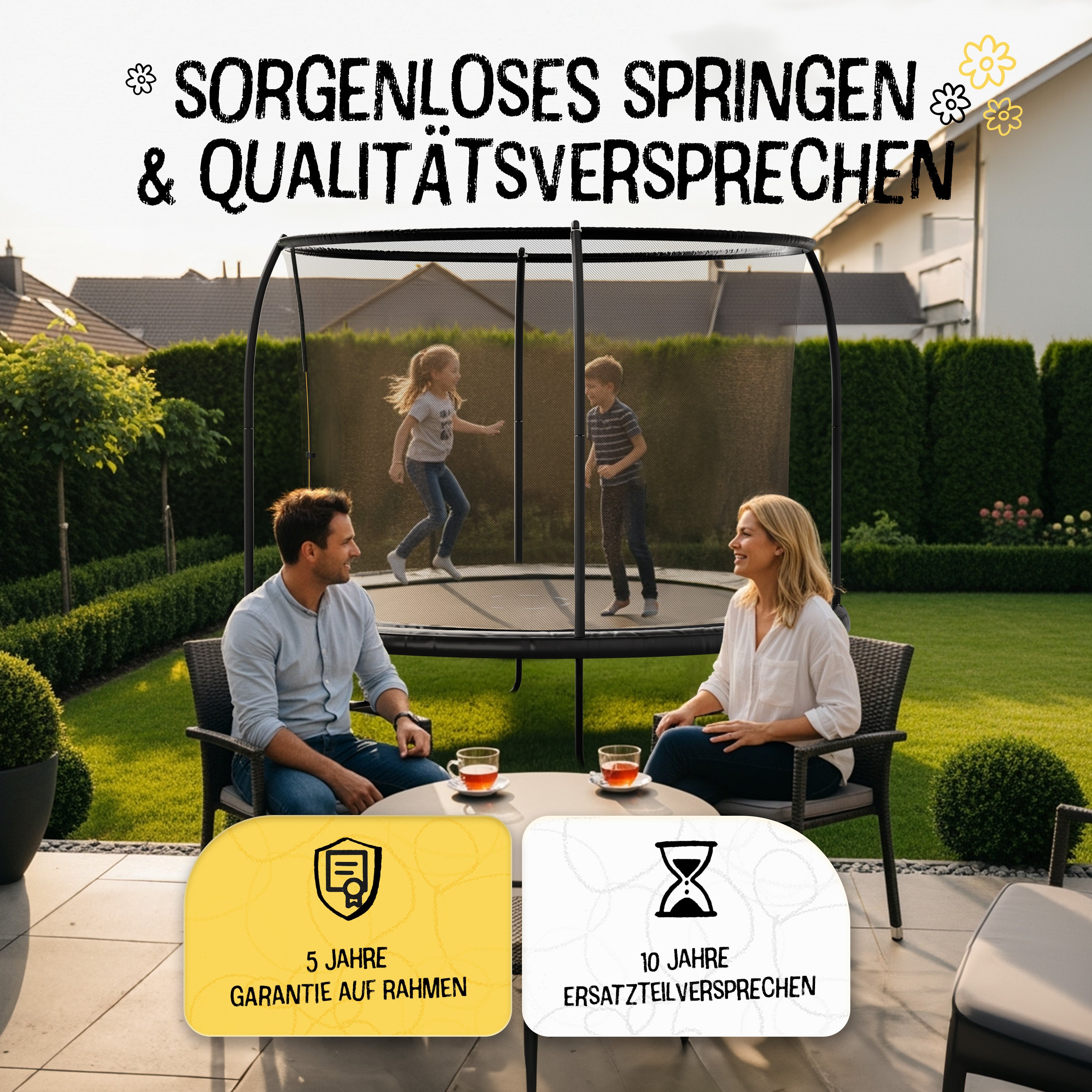 FÜR FAMILIEN GEMACHT – Nach EN71-14 zertifiziert. 5 Jahre Garantie auf den Rahmen und 10 Jahre Ersatzteilgarantie. Lieferumfang: Trampolin, Leiter, Handschuhe, Federspanner, Anleitung